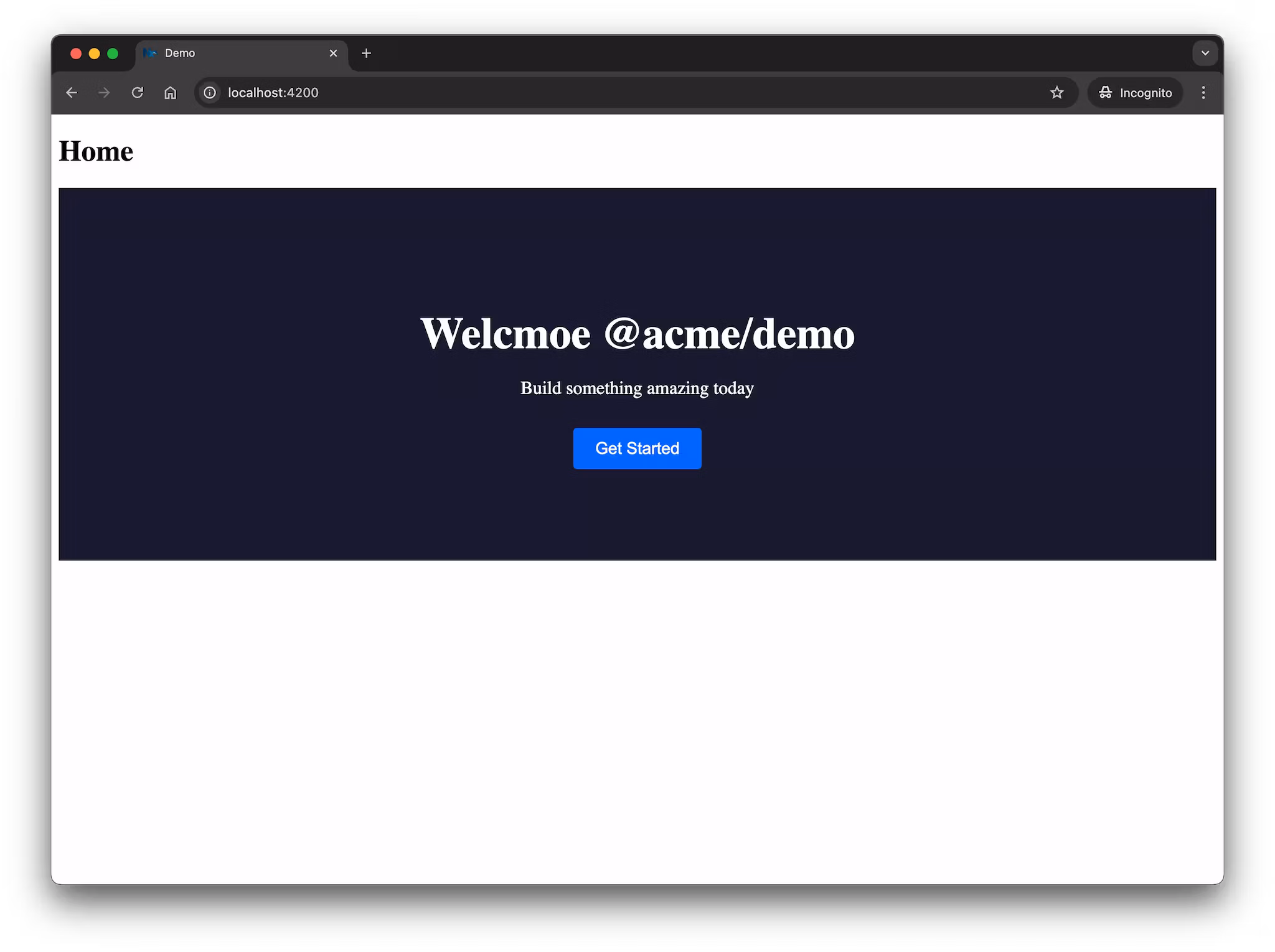 export default App;Serve your app again (npx nx serve demo) and you should see the new Hero component from the ui library rendered on the home page.